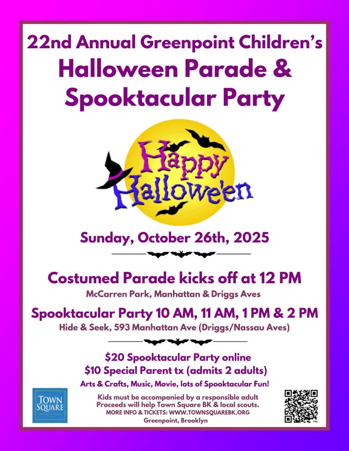 Calling all princes and princesses, heroes and villains, witches and wizards! Join Town Square BK for our popular annual Greenpoint Children’s Halloween Parade and Spooktacular Party!