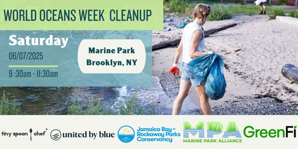 Come celebrate World Oceans Day by cleaning up Marine Park with our partners United by Blue, Jamaica Bay Rockaway Parks Conservancy, Marine Park Alliance, GreenFi, and Tiny Spoon Chef.