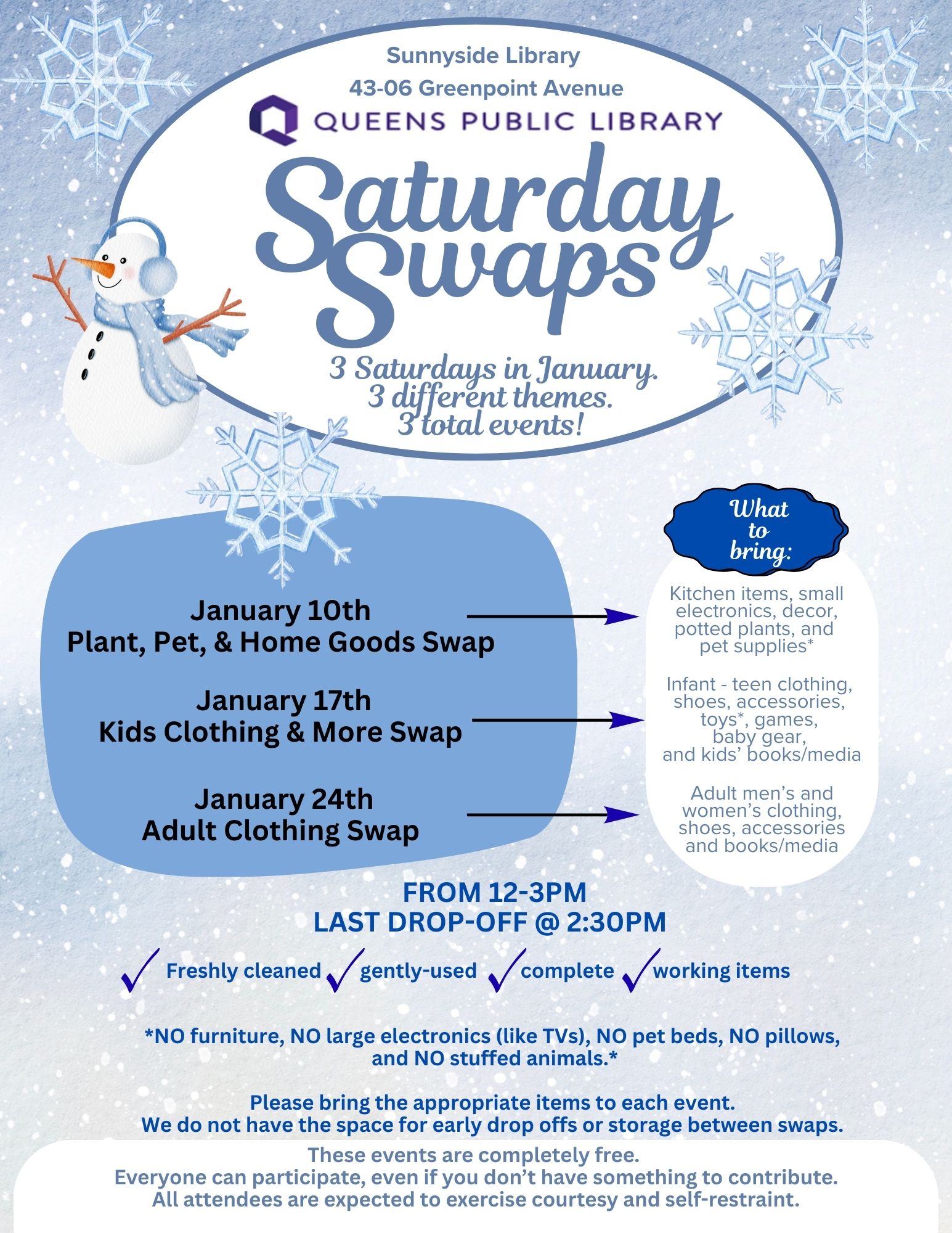 Start off 2026 fresh! Clean out your closets and make room for something new at one (or more) of the Saturday Swaps at the Sunnyside Branch library this January.